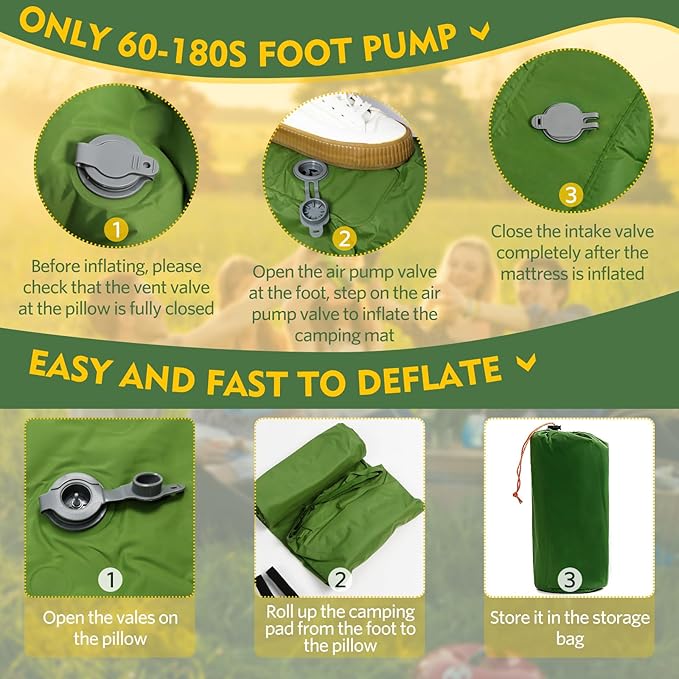 - ⛺【BUILD-IN FOOT PUMP FOR FAST INFLATE】This sleeping pad for camping have a built-in foot-operated air pump, just use your foot to constantly step on the pump position, you can inflate the camping mattress sleeping pad fast in 2 minutes. No need to pack an extra pump to save backpack burden. The deflation valve is designed with a double valve to prevent air leakage.
