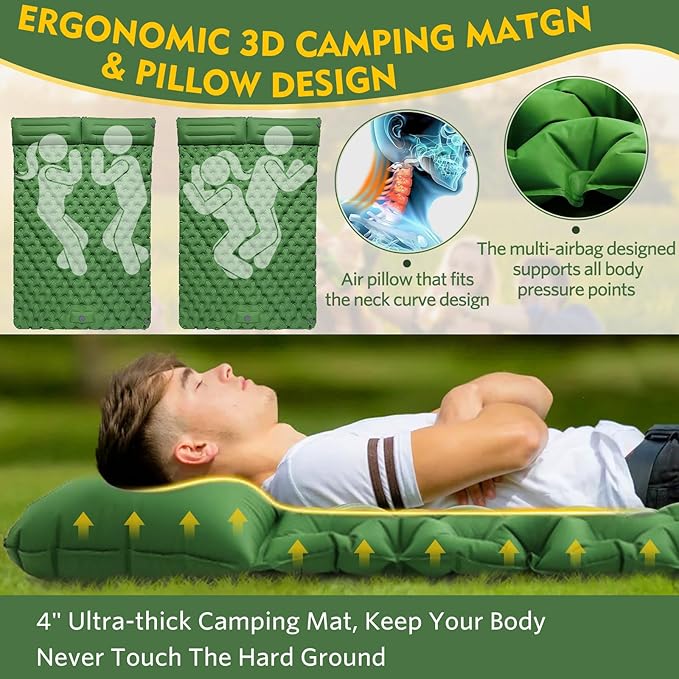 - ⛺【ERGONOMIC 3D DESIGN CAMPING MAT】The self inflating camping pad with 4" thickness pillow fits ergonomically, the 3D flower structure separates this camping mattress into a bunch of small cushions, which distribute body weight and provides maximum relaxation. This high quality portable camping mat is great sturdy and super comfortable - Perfect for any sleep position!