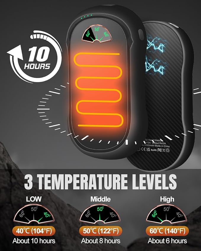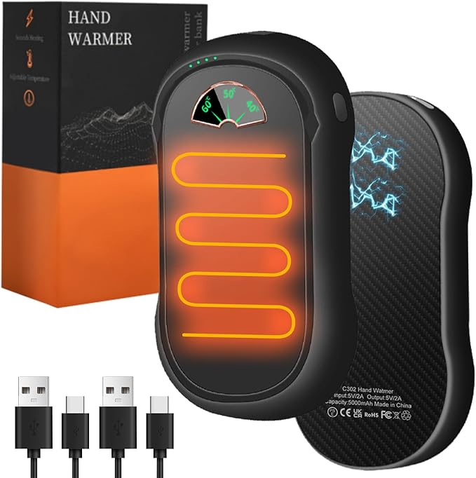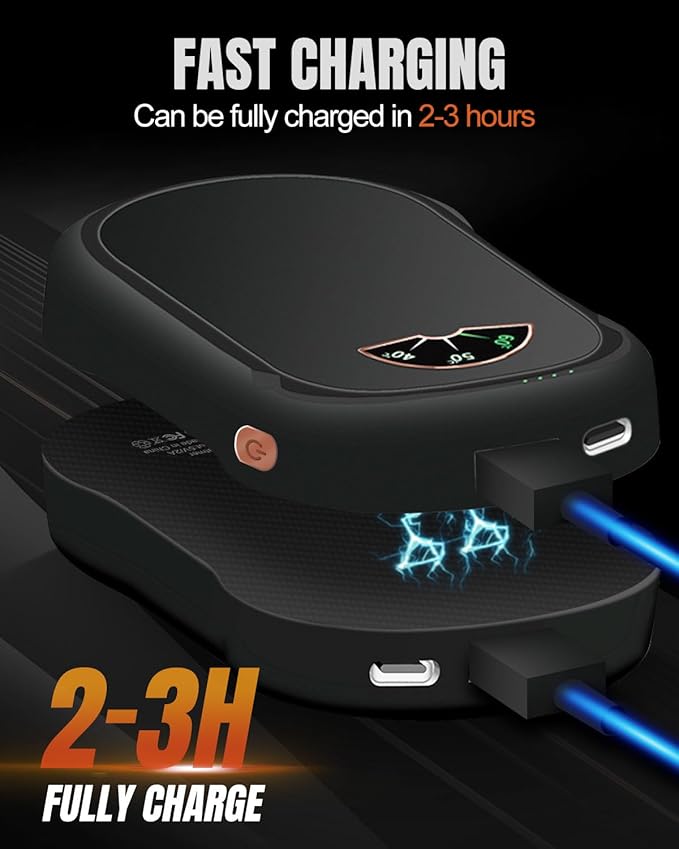 - [ Type-C Rechargeable ] Unlike other products with only USB-C to recharge, our heater adopts Type-C port, which makes it recharging much faster. Adopting totally 10000 mAh large capacity batteries, our heater can bring you longer lasting warmth.