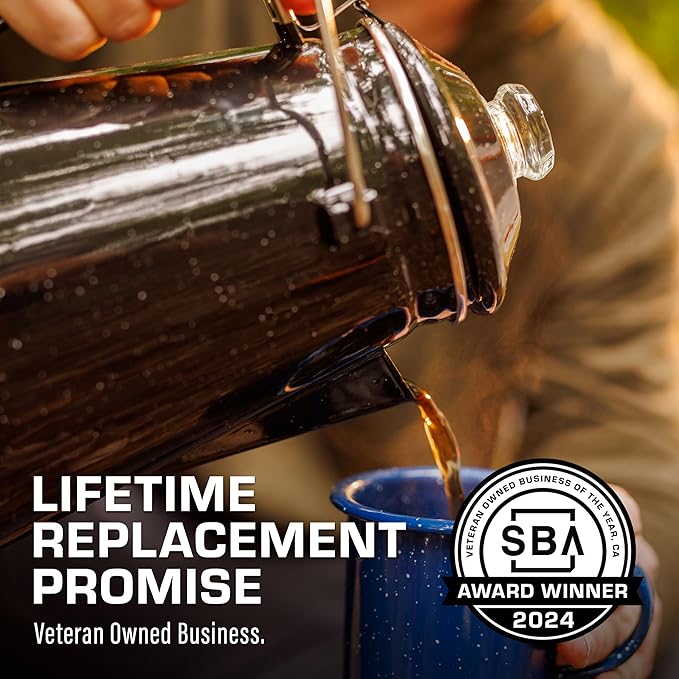 - LIFETIME REPLACEMENT PROMISE: Top materials & workmanship enable a superb promise. Shop with confidence. This is the last camping coffee pot you will ever need. US-based customer service provided by veterans