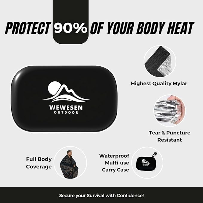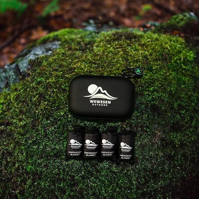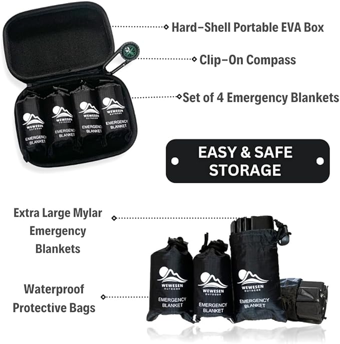 - Preparedness Pack: Never be caught off guard again! The WeWesen Outdoor Emergency Blanket 4-pack comes in a durable EVA carry case for easy portability and protection. Keep a set in your car, backpack, or home for instant warmth and safety in any situation.