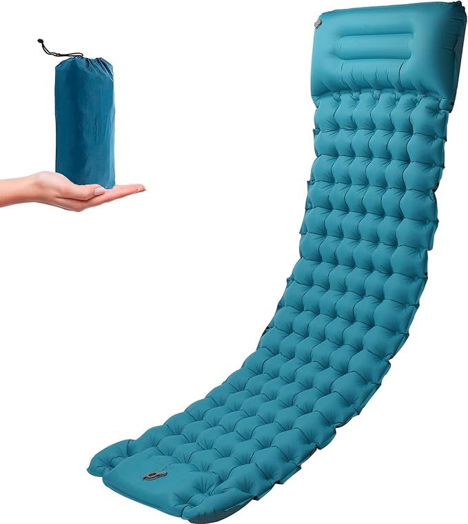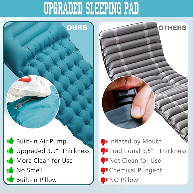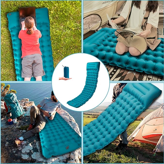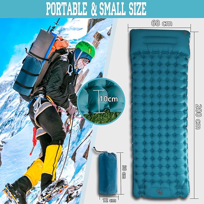 - 💦Built-in Foot Pump:The sleeping pad features a built-in foot pump, NO mouth blowing, no extra pump,no hands, clean and hygienic to make inflating this camping mattress a breeze. Two double layer valves on the pillow can effectively prevent air leakage and achieve rapid deflation,quick and easy inflation.(Only need 3 Minutes above)
