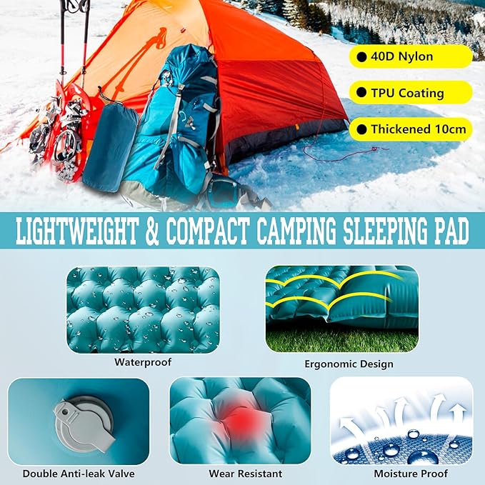 - 🏕️Backpacking Sleeping Pad: ULTRALIGHT & PORTABLE Camping sleeping mat are made of heavy-duty 40D nylon and TPU coating eco-friendly materials which makes it tear-resistant, waterproof & abrasion resistant,providing enough durability and comfort,increase the weight-bearing capacity of the inflatable sleeping pad to 800lbs,A perfect choice for families to camp out.