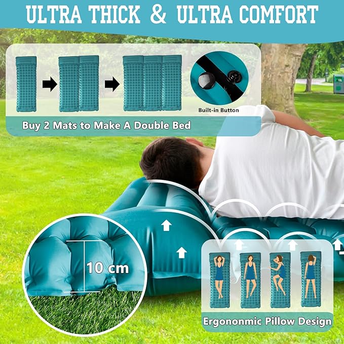 - 🌴Comfortable & Relaxing Design: The camping pad PLUS an ergonomic one-piece pillow to protect your cervical spine. The surface of the inflatable sleeping pad meet the curve of the human body, effectively disperse gravity can prevent the situation from contacting the ground for a better rest.