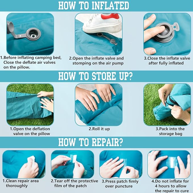 - Packaging & Warranty: The camping mattress are packing with 1x Sleeping Pad; 1x Binging Belt; 1x Storage Bag; 1* Instruction; 3x Patch (When pad demaged , you could use it to repair, save your money); 👍We offer ONE YEAR item warranty, Free replacement or refund for defective,with a 100% satisfaction customer service for you.