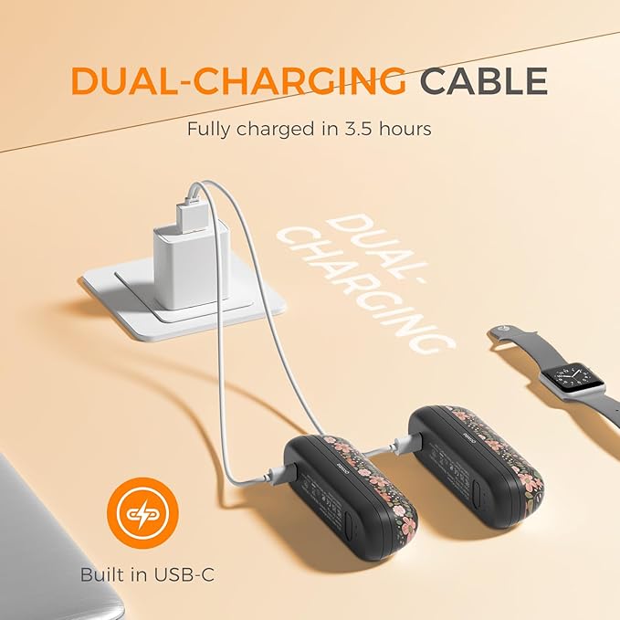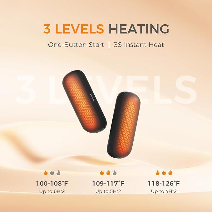 - Instant Heat, Lasting Warmth: Heat release in just 3 Seconds, 3 temperature settings up to 126 °F, Heat duration up to 4 to 6 hours; We offer a split USB-C charging cable, saving you charging time and allowing you to enjoy more warmth