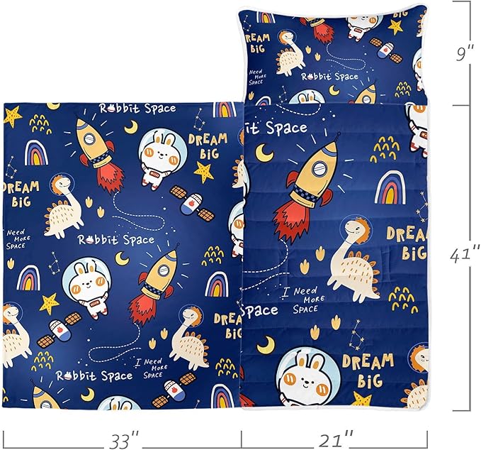 - Size - Nap mat measures 60“x21”x3“, comes with 21”x9" removable pillow. Attached blanket measures 51” x 33”. Suitable for children ages 3 to 7.