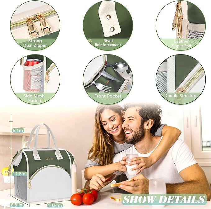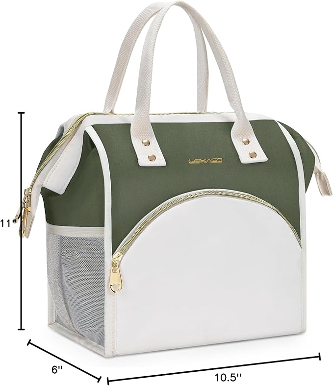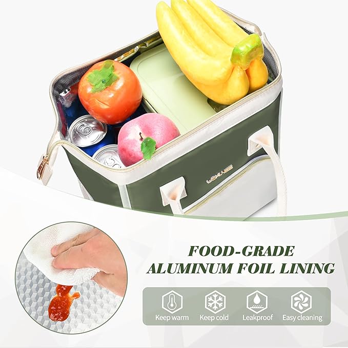 LOKASS Lunch Bag Women Insulated Lunch Box, Wide-Open Lunch Tote Bag Leak-proof Cooler Bag for Work Picnic-(Army Green)