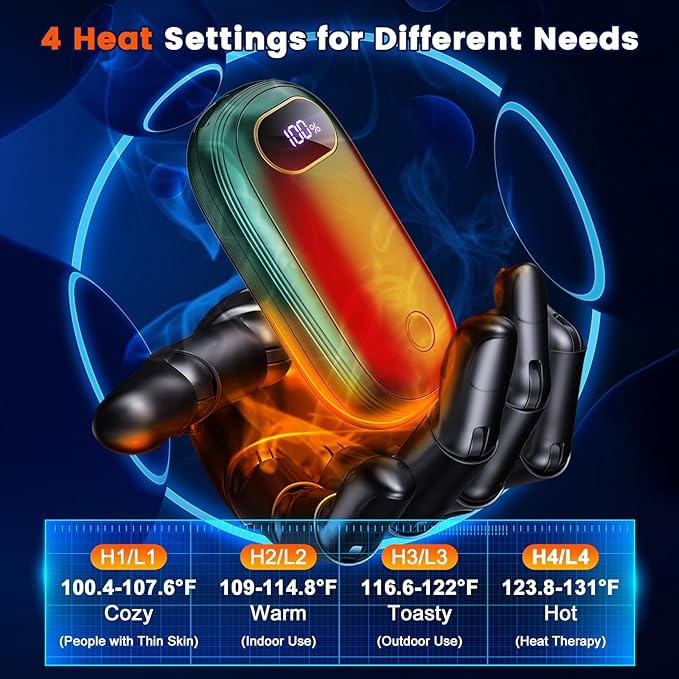 - 【Adjustable Heat Settings & Modes】4 heat levels (100-108℉/109-115℉/116-122℉/123-131℉), single/double side heating options, providing a total of 8 heating modes, whether you need a gentle warmth for everyday use or a high heat blast to combat freezing conditions, just 2s fast heating, our electric hand warmers have you covered.