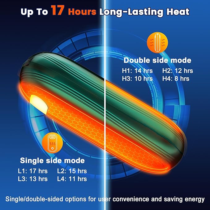 - 【 Experience Prolonged Warmth! 】Our reusable hand warmer delivers rapid 2s heating. After a 3-4 hrs charge, it provides up to 17 hours of continuous warmth! Opt for dual-side heating (H1/H2/H3/H4) to enjoy 6 to 12 hours of all-around warmth. If you prefer single-side heating (L1/L2/L3/L4), you'll have 11 to 17 hours of warmth.