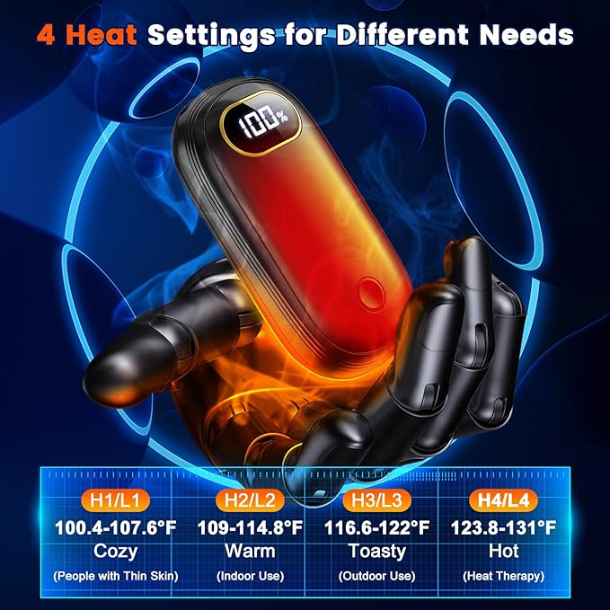 - 【Adjustable Heat Settings & Modes】4 heat levels (100-108℉/109-115℉/116-122℉/123-131℉), single/double side heating options, providing a total of 8 heating modes, whether you need a gentle warmth for everyday use or a high heat blast to combat freezing conditions, just 2s fast heating, our electric hand warmers have you covered.