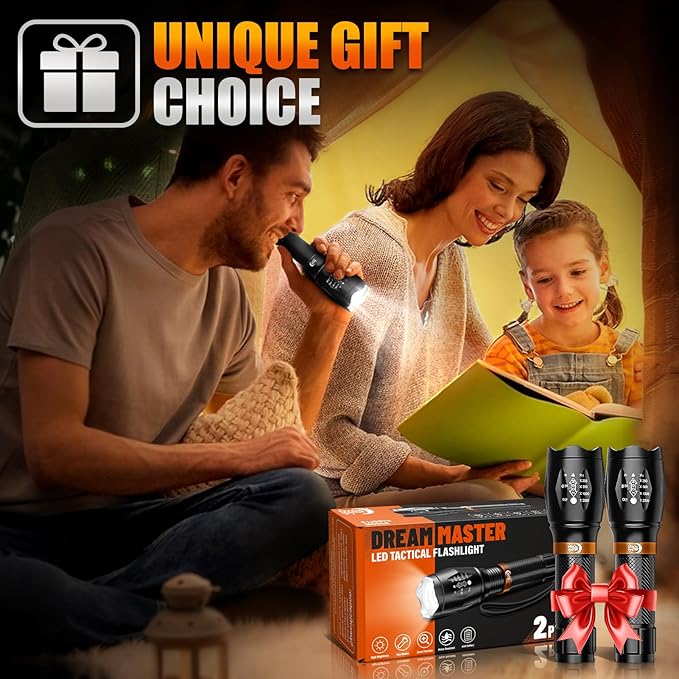 - GIFTS FOR MEN: This versatile flashlight package includes 2 LED Tactical Flashlights, 6 AAA Batteries, 2 AAA Battery Holders, 2 Battery Tubes, 2 Hand Straps, 2 Holder Cases (Bonus Accessory) and 1 Operation Guide. These make for a perfect stocking stuffers gift. Be prepared for any situation with a reliable, compact, and high-quality lighting solution that suits everyone's needs. Great idea as a Christmas Valentine's Day, Father's Day, Halloween or Thanksgiving gift