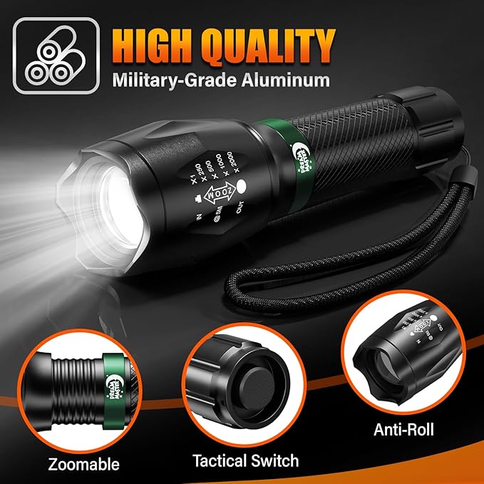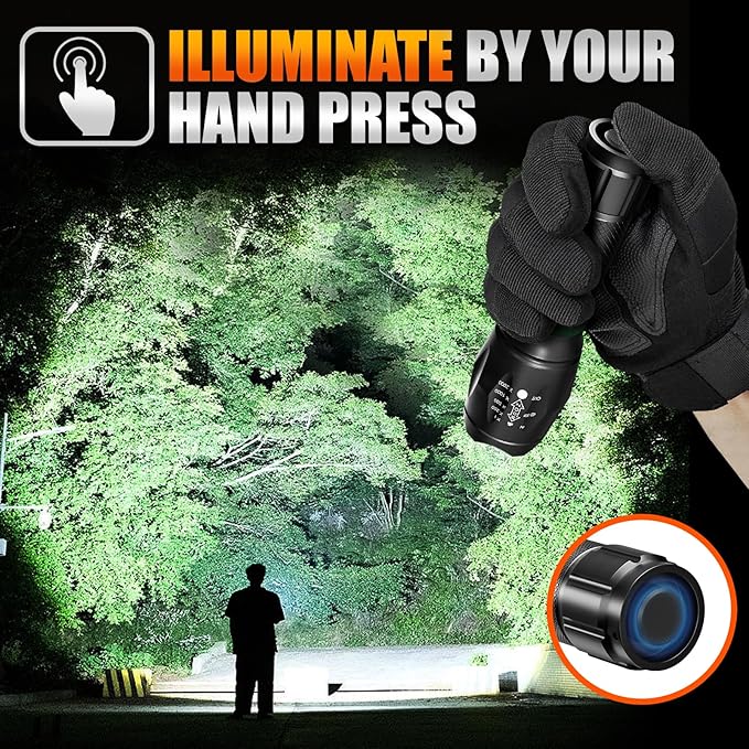 - MULTIPLE LIGHTING MODES & ZOOMABLE BEAM: These flash lights easily switch between 5 modes (High, Medium, Low, Strobe, SOS) for various tasks, all controlled by hand press. Zoom in for precision or broaden the beam for wide-area coverage