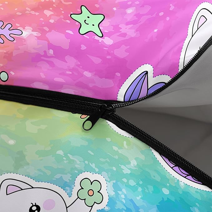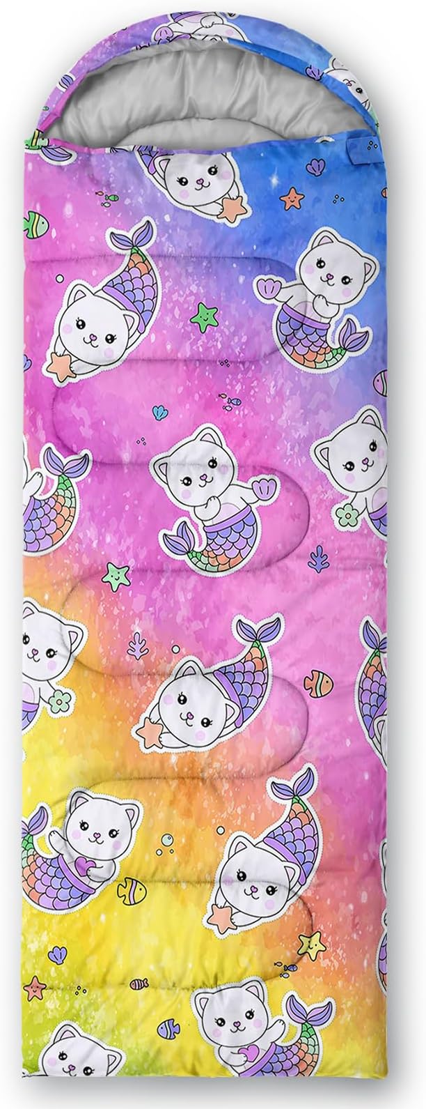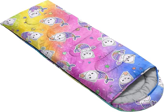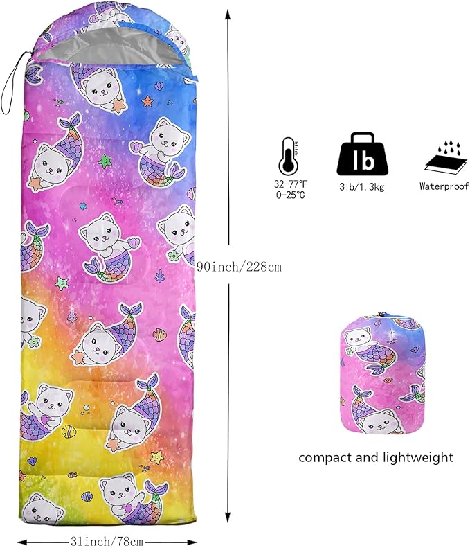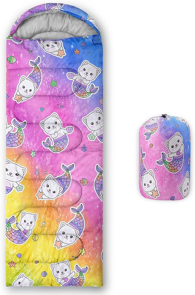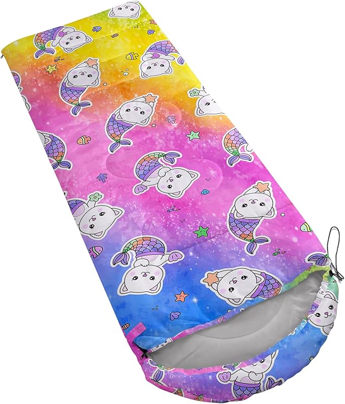 - A THOUGHT OUT DESIGN: Drawstring allows you to tighten hood and keep you warm. The idea of having a zipper at the foot to allow more warm or cool air to enter or exit the bag in different times of the season.Our Rainbow Cartoon Kitten sleeping bags are designed to provide much needed rest after a full day of outdoor activities.