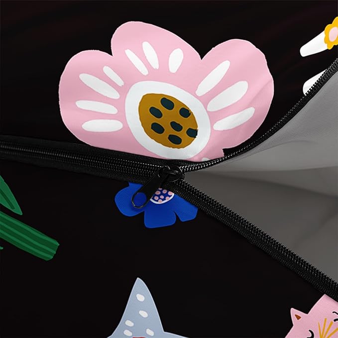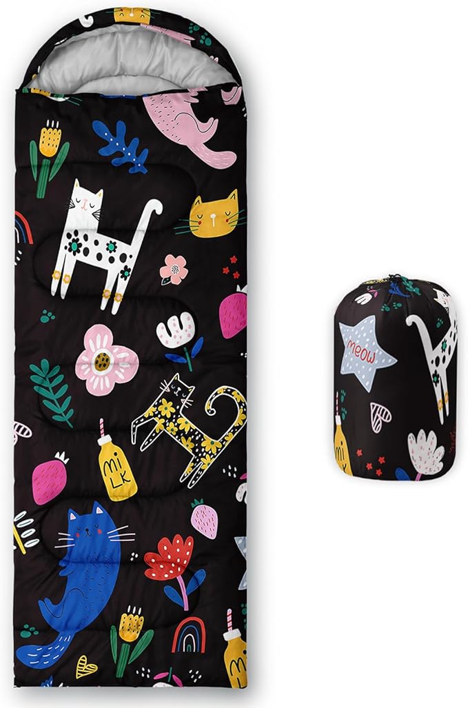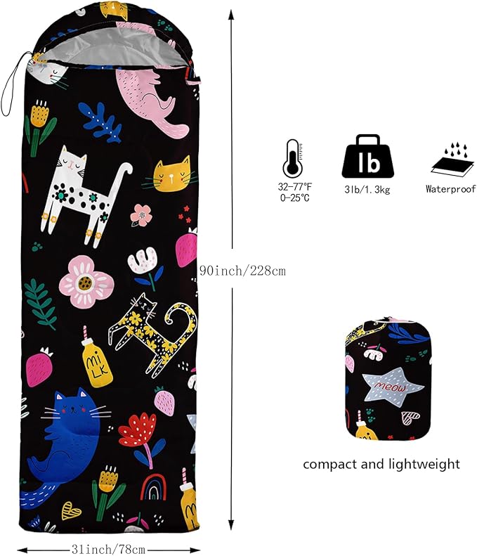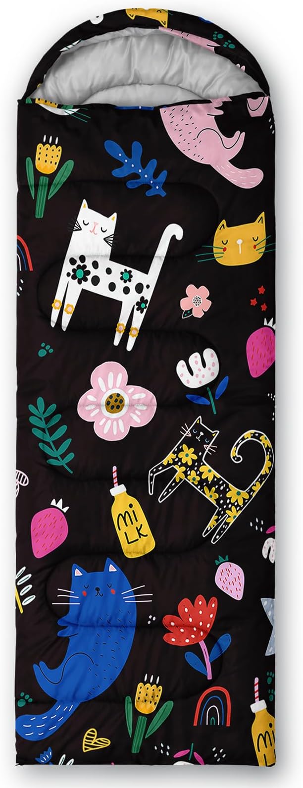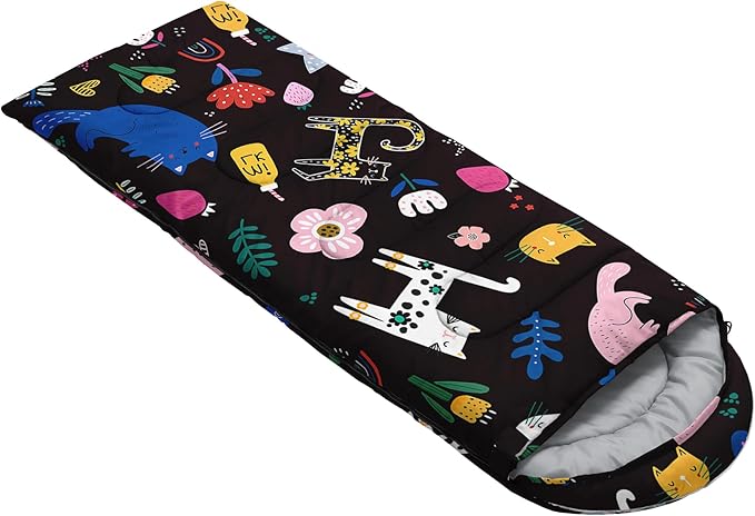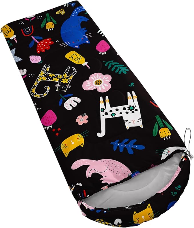 - A THOUGHT OUT DESIGN: Drawstring allows you to tighten hood and keep you warm. The idea of having a zipper at the foot to allow more warm or cool air to enter or exit the bag in different times of the season.Our Cute Cartoon Cat Flower sleeping bags are designed to provide much needed rest after a full day of outdoor activities.