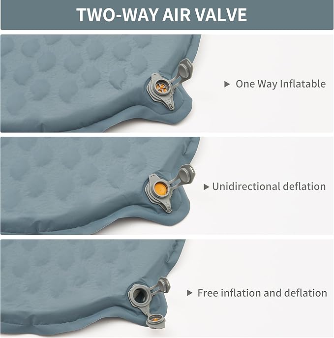 - 【TWO-WAY INFLATION VALVE】One side inflates and one side deflates, free flip to switch modes. Note: Auto-inflating and then replenishing the air cushion with the mouth can make the air cushion more hard and firm