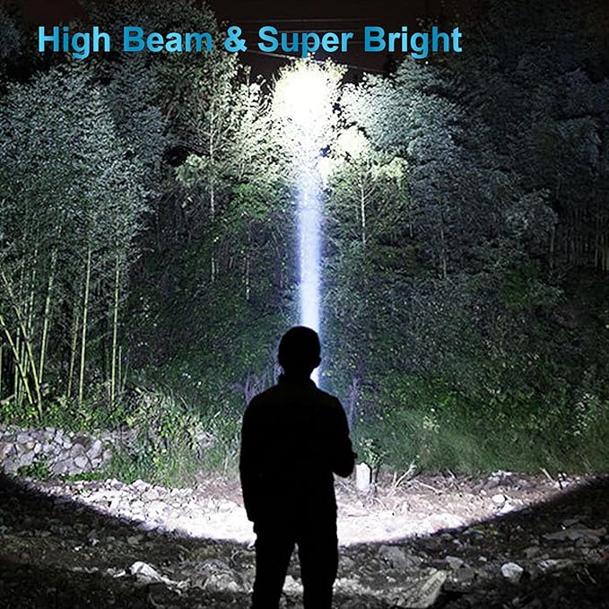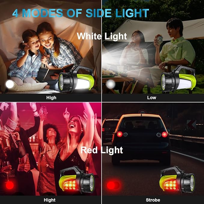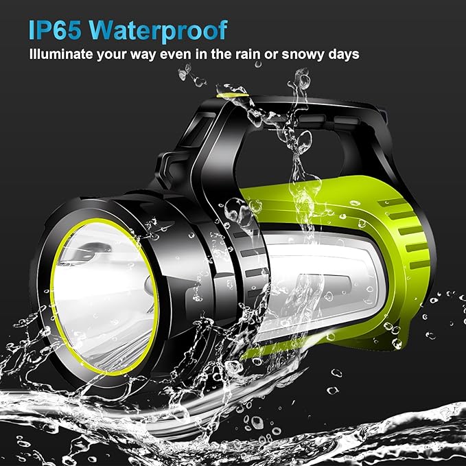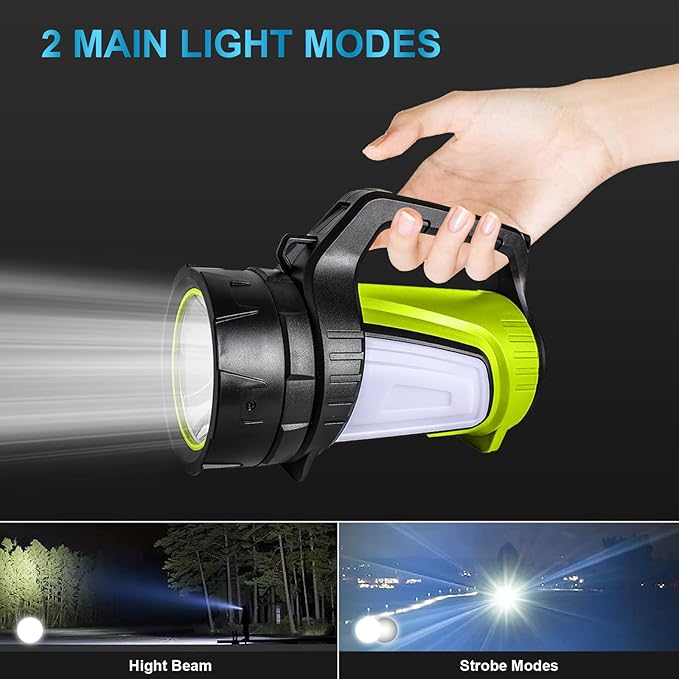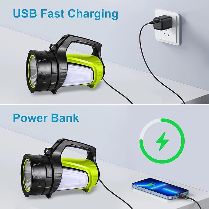 - 【Bigger, Brighter, Longer Lasting】Rechargeable led spotlight with a solid build and blinding brightness, large-area irradiation, and Irradiation distance of up to 1000 meters.Suitable for camping, hiking, fishing, emergencies, targeted searches and general household use, etc.