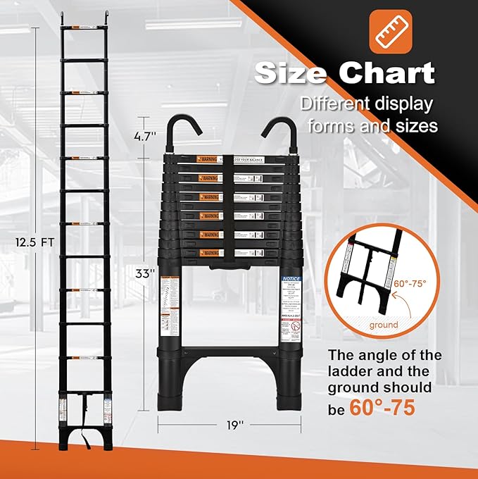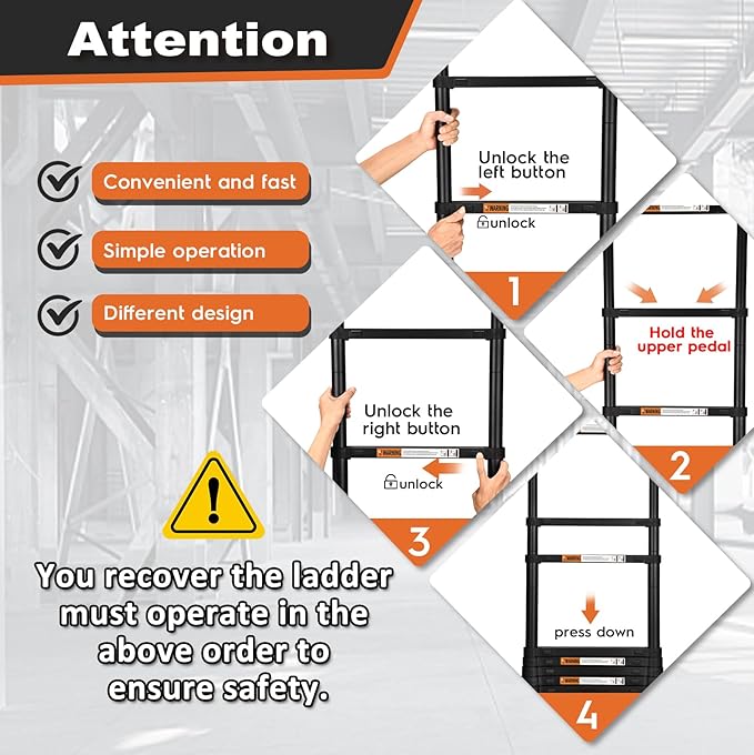 - Multi-Scene Application: Changing light bulbs and going up to the attic indoors, or repairing roofs or climbing into RVs outdoors, our aluminum retractable ladders can be used in any scenario where you need a ladder.