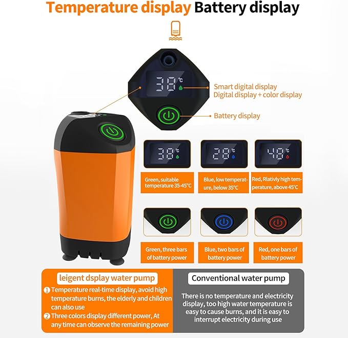 - Intelligent Digital Display: Real-time power level display,Green light indicates full power,Blue light indicates medium power,And Red light indicates low power to help clearly understand the power status; Real-time water temperature display,Applicable range 32-140°F, Water temperature is 35-45℃,The indicator light is green; Water temperature is below 35℃, The indicator light is blue; Water temperature is higher than 45℃, The indicator light is red.