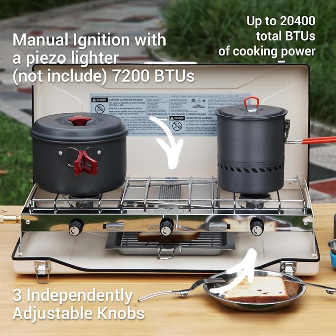 - ADJUSTABLE 3 BURNERS : This camping gas stove is equipped with 3 independently adjustable knobs, two of Piezo ignition burners with 6,600 BTU power. The middle downward burner is designed for toasting, 7200BTU power and requires manual ignition. We recommend that you use a piezo lighter. It relies on heat radiation to heat and won't burn the toast