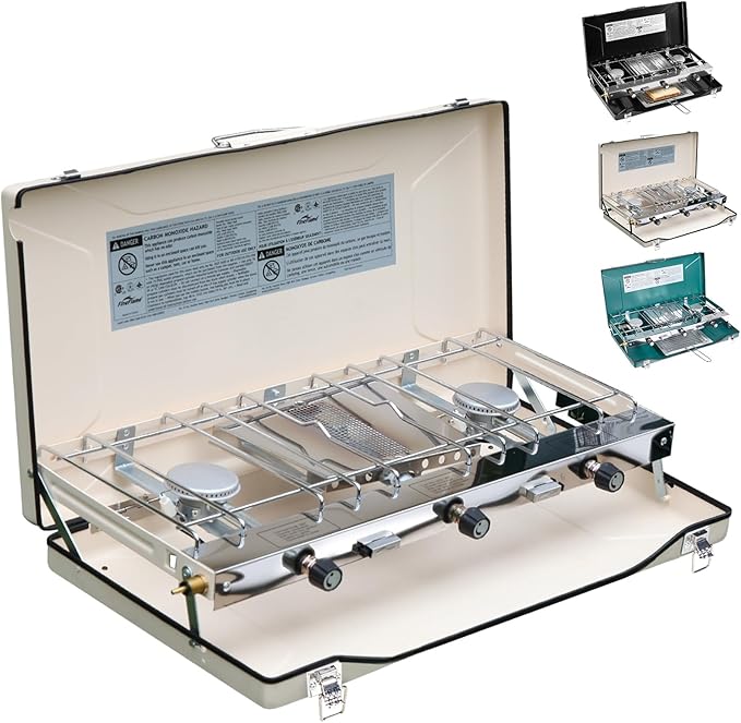 - PORTABLE: This 3-burner portable camping stove comes with a carry handle that allows you to carry it conveniently. It has a compact structure and weights only 10lbs which makes it even easier to carry it around. It can be taken along in a luggage or storage box, or even large tote bag, so carrying this portable propane camping stove is a breeze thing to do! Size: 23.4”x12.8”x3.4", Weight:9.9 LB