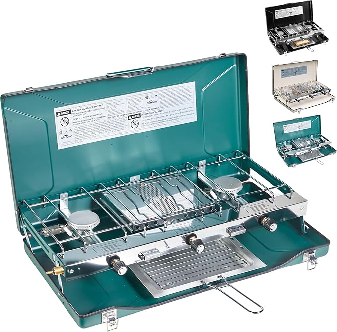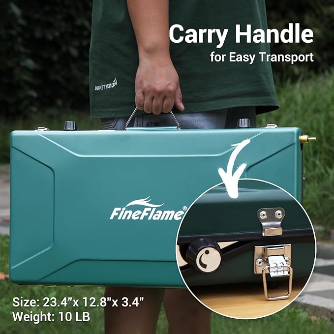 - PORTABLE: This 3-burner portable camping stove comes with a carry handle that allows you to carry it conveniently. It has a compact structure and weights only 10lbs which makes it even easier to carry it around. It can be taken along in a luggage or storage box, or even large tote bag, so carrying this portable propane camping stove is a breeze thing to do! Size: 23.4”x12.8”x3.4", Weight:9.9 LB