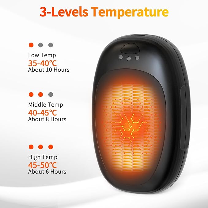 - 【2S Quick Heating Up】 Electric hand warmer with 3 modes of temperature, they are low temperature(35-40℃), middle temperature(40-45℃), high temperature(45-50℃) for you to choose. It will heat up in 2 seconds and provide warmth for you after long press the button.