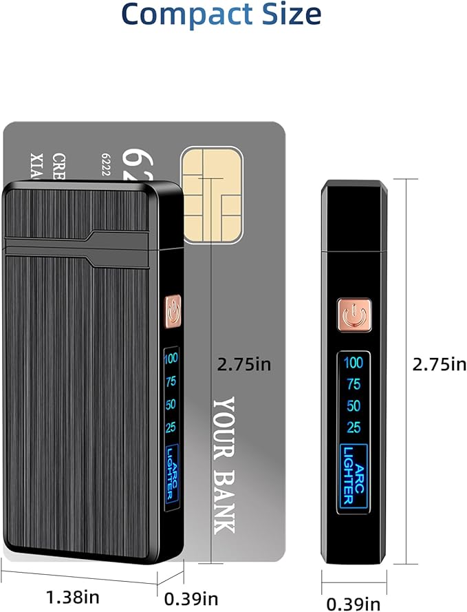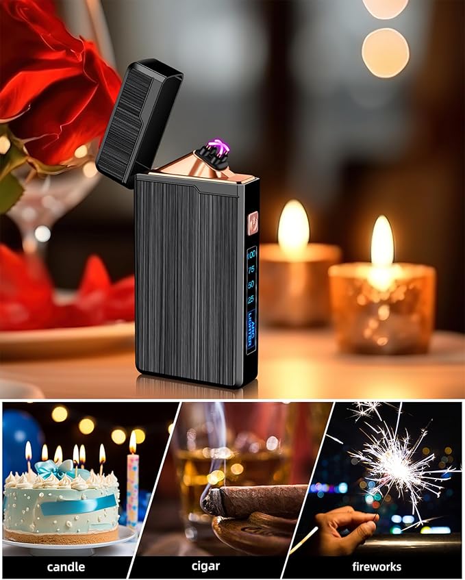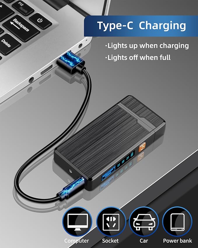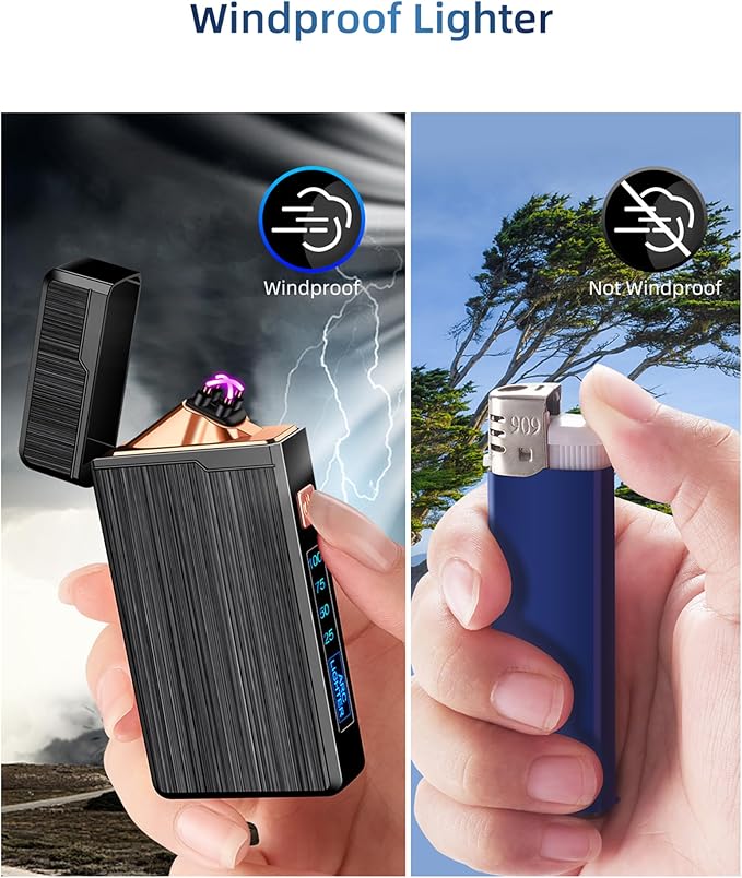 - WIND & SPLASH PROOF: The electric windproof lighter is butane free and no harmful chemical.The flameless lighter can ignite things under bad weather.
