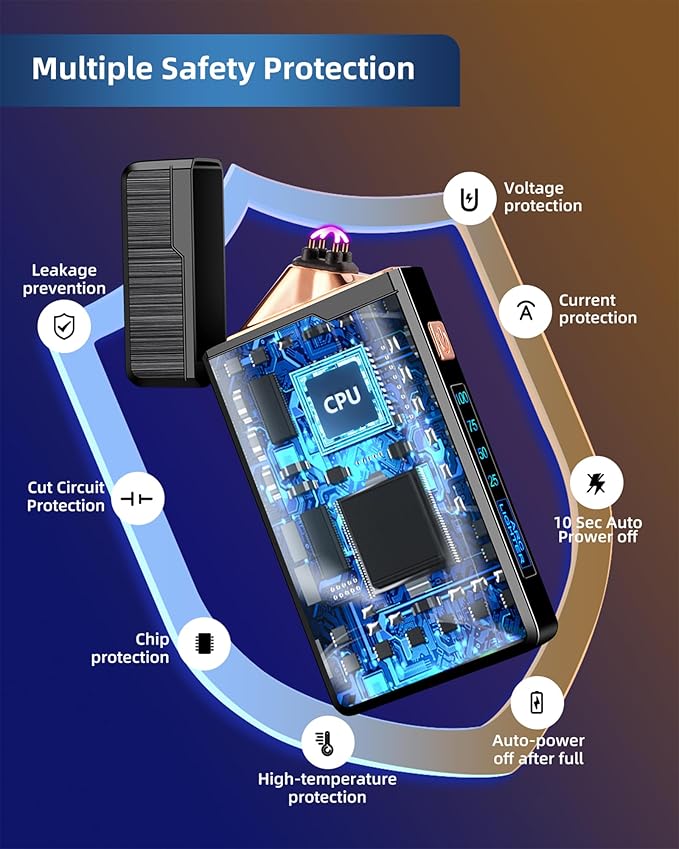 - SAFETY PROTECTION SYSTEM: The electric dual arc lighter will automatically turn off after about 10 seconds per use to protect the lighter from high temperature inside.
