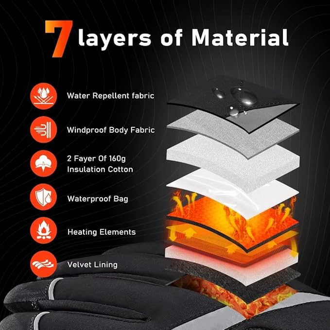 - 【Temperature-locking, Waterproof And Lightweight】EAY Rechargeable Heated Gloves are made of up to 7 layers of material for better temperature locking. The special material of the surface layer ensures waterproof and windproof. Microfiber material in the palm part is more anti-slip and wear-resistant. Velvet lining is comfortable to wear and warmer.