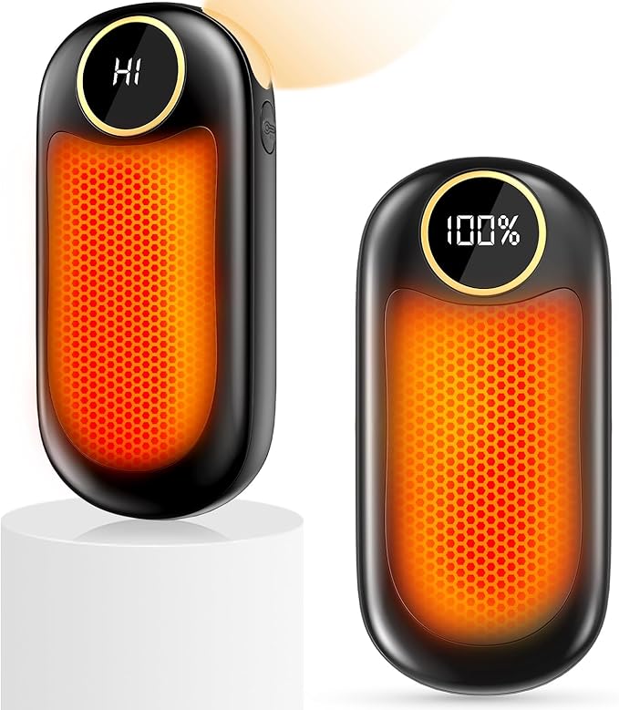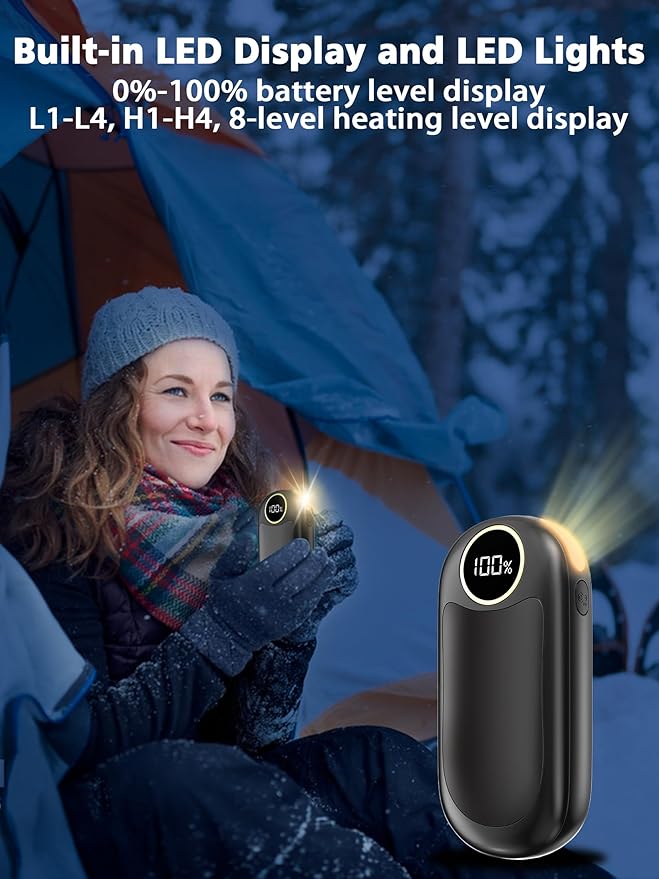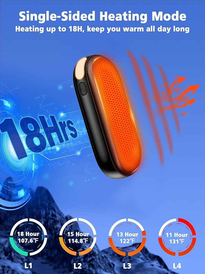 - 2 Sided Heating & 4 Heating Levels: The hand warmer reusable has 8 heating modes, 4 heating levels, and can heat up to 131 ℉. L1/L2/L3/L4 for single sided heating. H1/H2/H3/H4 is used for double-sided heating. Rechargeable hand warmer heats up quickly in 2 seconds. With the help of the LED display, you can check the remaining power and easily adjust the heating mode, free your battery anxiety