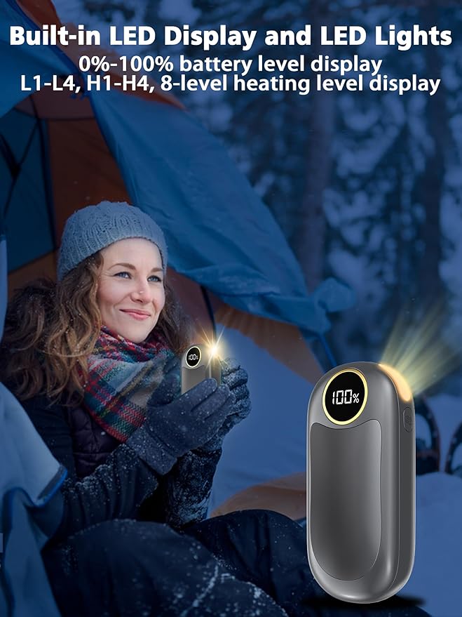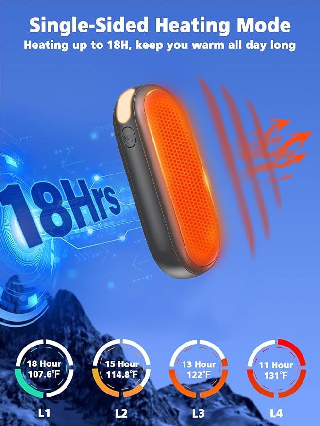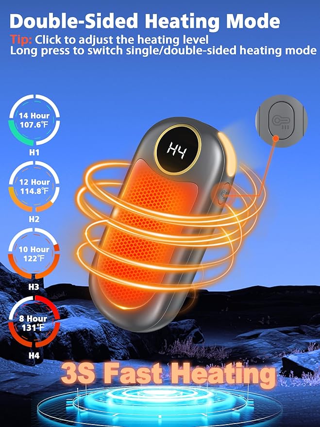 - 2 Sided Heating & 4 Heating Levels: The hand warmer reusable has 8 heating modes, 4 heating levels, and can heat up to 131 ℉. L1/L2/L3/L4 for single sided heating. H1/H2/H3/H4 is used for double-sided heating. Rechargeable hand warmer heats up quickly in 2 seconds. With the help of the LED display, you can check the remaining power and easily adjust the heating mode, free your battery anxiety