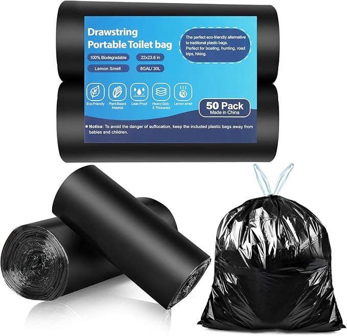 100 Portable Toilet Bags, Drawstring Biodegradable Camping Potty Bags 8 Gallon Waste Bags for 5-8 Gallon Bucket Toilet Adults Outdoor Camping Car