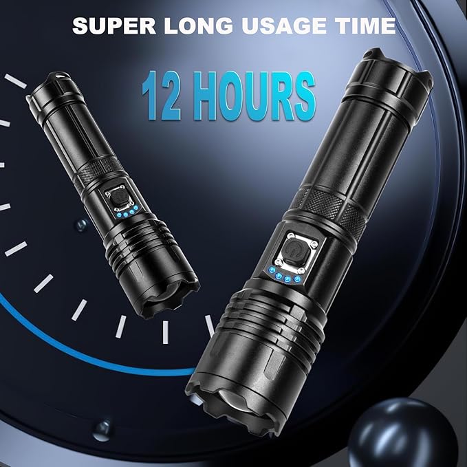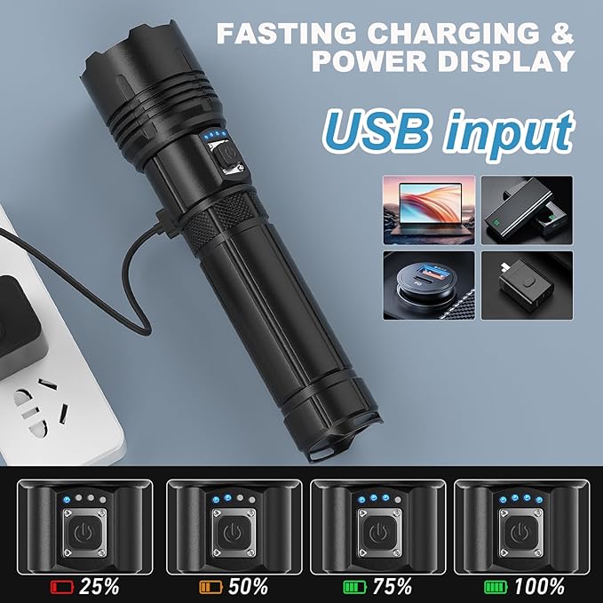 - 【FAST CHARGER & POWER DISPLAY】Rechargeable flashlight comes with a high power rechargeable ΒATTERY, it can be recharged 150,000 times to reduce ΒATTERY waste.High powered flashlight Built-in 5000 ɱAh high-capacity, making the LED flashlight can work 8-12 hours. Saves you from the trouble of long hours without light for outdoor activities. The power indicator allows you to keep track of the Βattery level. Each light represents 25% of the Βattery. When it is fully charged: 4 lights are on.