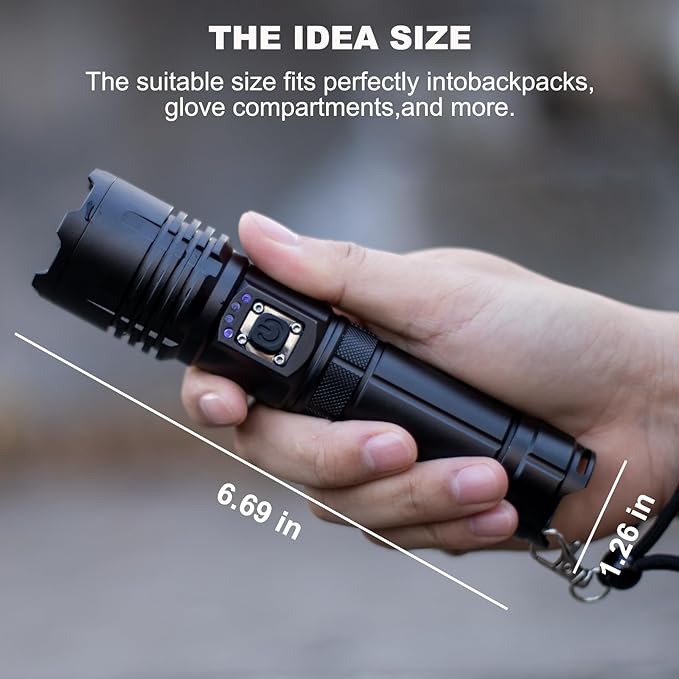 - 【HIGH QUALITY & IPX7 WATERPROOF】This Powerful flashlights high lumens is made of military-grade aluminum alloy as the body material, and the shell strength can withstand a 10-foot drop..bright flashlight is IPX7 waterproof. there is a waterproof rubber ring at the charging port, which can be used in rain, snow, or wet environments. Providing high lumen light even in emergencies.