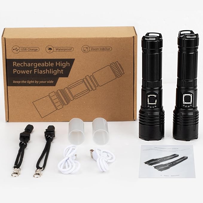 - 【PACKAGING & 2-YEAR WARRANTY】Package: 2 Led rechargeable flashlight, 2 USB charging cable, 2 Rechargeable bā ttery , We have carefully checked all products before shipment and ensured that they are working properly. Please feel free contact us if you are not satisfied with our product.