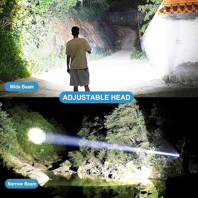 - 【5 LIGHTING MODES & ADJUSTABLE】This High Powered flashlight has 5 lighting modes to easily adapt to any environment: High/Medium/Low/Strobe/SOS. Use the adjustable functions of this powerful flashlight to achieve wide and narrow beam lighting, allowing you to personalize your lighting zone. Long press 3s in any mode then you can turn off the flashlight.