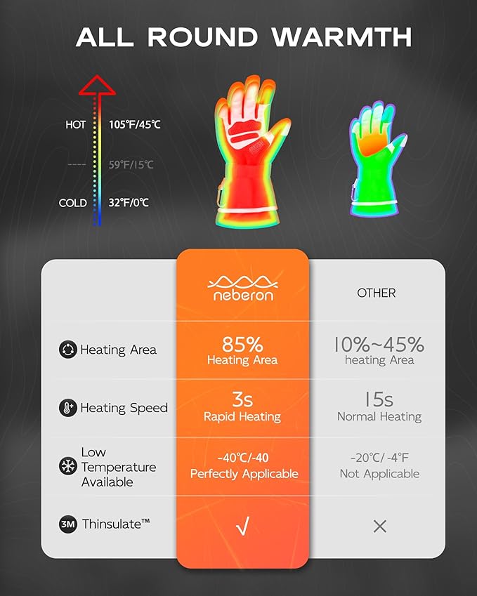 - [Safer & Longer-Lasting Warmth] Neberon Heated Gloves are equipped with a brand-new 7.6V battery. The higher voltage allows for rapid heating in just 3 seconds, allowing you to feel warmth faster, while the long-lasting warmth extends for up to 8.5 hours.