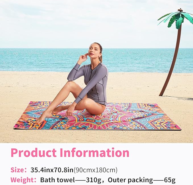 - ✔️【LIGHTWEIGHT AND SUPER SOFT】: No need to worry about your bag weighing too much when you travel with our microfiber beach towels, this beach towel only has about 0.66 LB. Soft as baby skin, it's perfect to use while traveling, exercising, swimming, bathing, camping, yoga, or simply dry up your face.