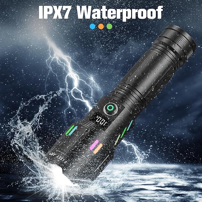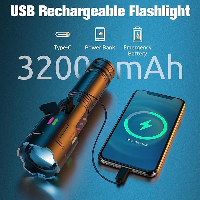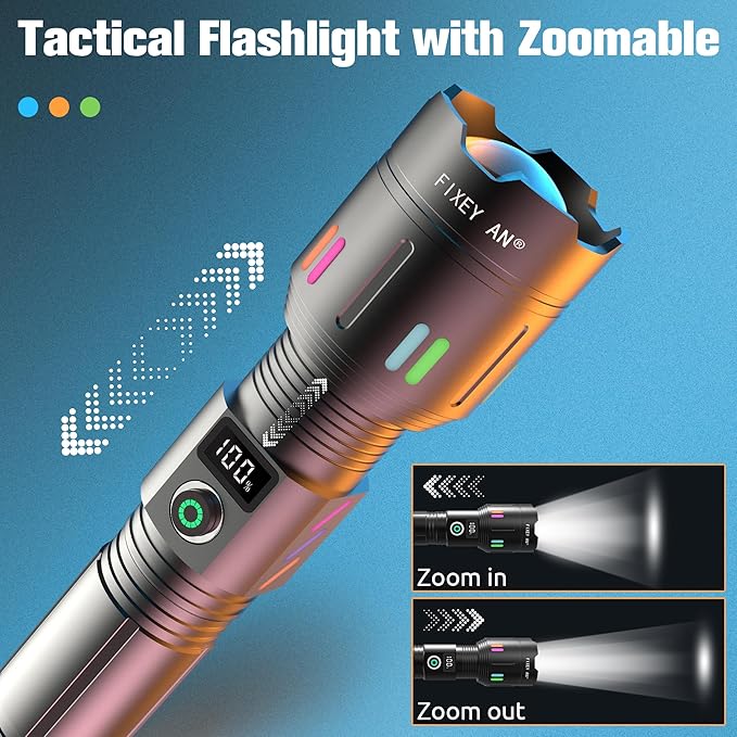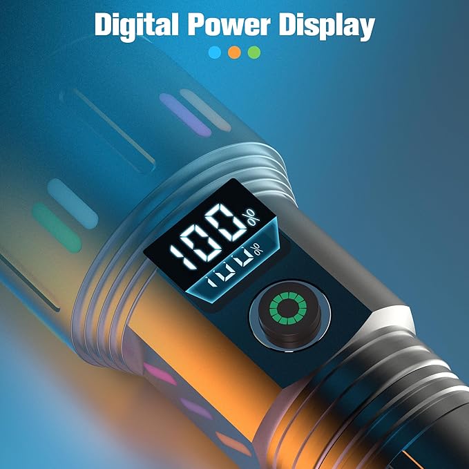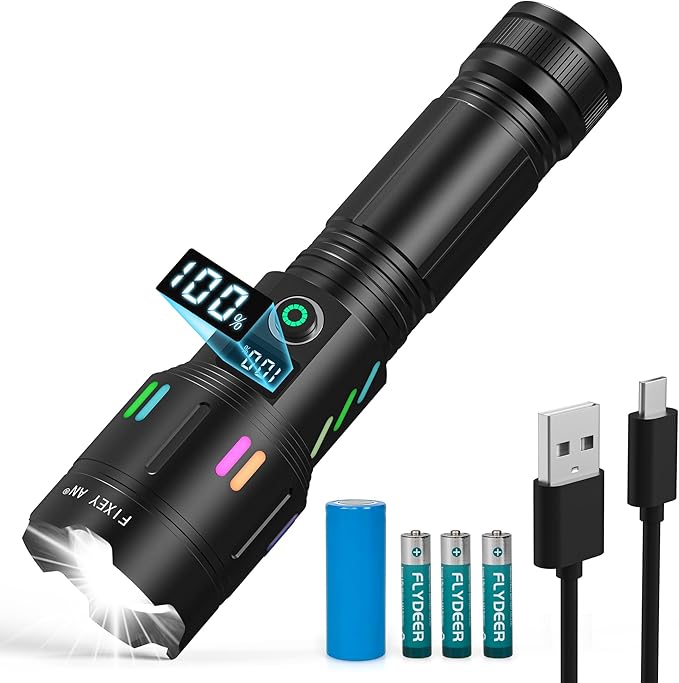 - 【Type-C Rechargeable & Digital Display】Rechargeable flashlight can be used as an emergency power bank. The fast charging port can make your tactical flashlight fully charged in 4-5 hours! The Led digital power display help to clearly know the power level of the handheld flashlights, so you're never need to be anxious. The product excludes the sale of restricted Standalone lithium batteries.