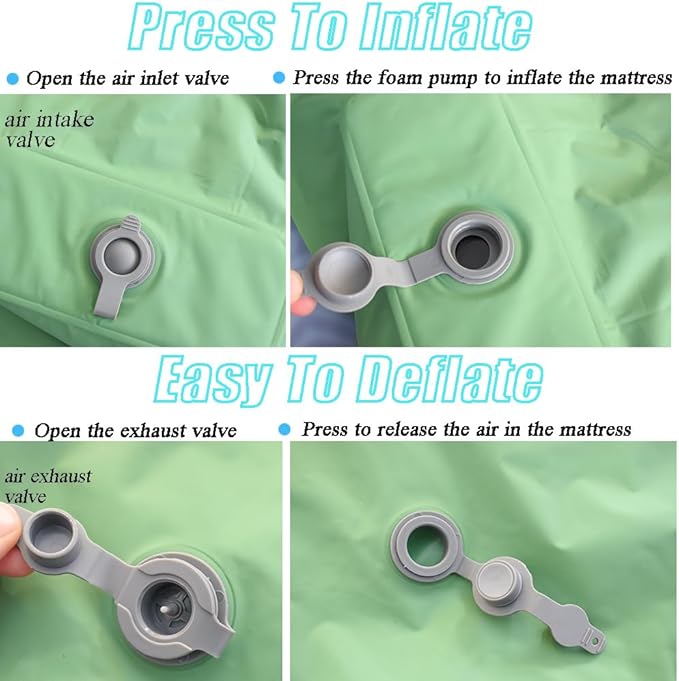 - 【EASY TO INFLATE/DEFLATE】Each double wide sleeping pad mattress has 2 valves, one for easy inflation with your feet or hands (no pump required) and the other for quick inflation and deflation