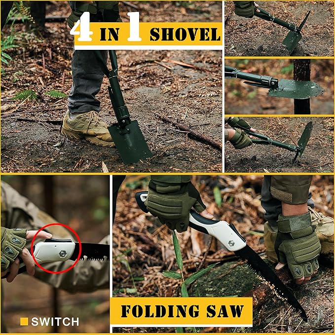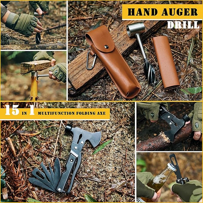 - 【Practical Survival Gear】This kit includes the most popular survival accessories: a multifunctional axe, a 3-mode flashlight, a carpenter's drill, a folding saw, a multifunctional card, a survival bracelet, a whistle, a wire saw, a paracord, an emergency blanket, fire-starting tools, fishing tools, a comprehensive first aid kit, and more. All of these gears ensure that we have the basic survival essentials in the outdoors.