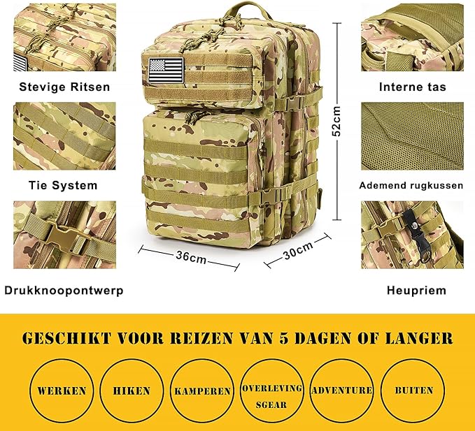 - 【45L Camping Backpack】The tactical backpack has multiple compartments and double-zipper closure pockets, including 2 large compartments, 2 small front compartments, and 1 back compartment. The tactical backpack dimensions are approximately 11.81" x 19.68" x 11.81" (width x height x depth). The military tactical MOLLE backpack is made of high-density double-stitched 900D Oxford cloth and nylon fabric, making it durable and waterproof.