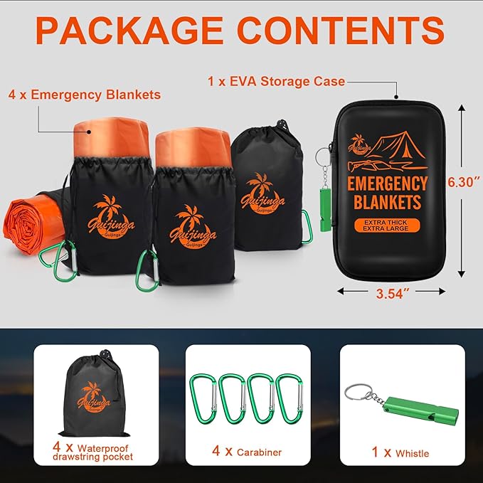 - 🔥【Extra Large & Extra Thick】: Guijinga products are 23% larger than other emergency blanket for car, offering 2-pack or 4-pack of 83" x 63" emergency blanket. survival blanket Made of premium PE material, they ensure durability and longevity, and sol emergency blanket 26-micron ultra-thick structure provides tear resistance, allowing you to protect yourself in harsh conditions.
