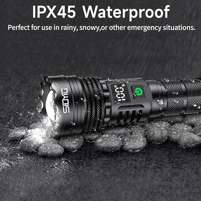 - 【IPX45 Waterproof & Strong Drop-Resistant Body】The waterproof flashlight is made of aviation aluminum alloy material, with IPX 45 waterproof rating and strong drop resistance. However, please be careful not to immerse the torch in water for long periods of time.
