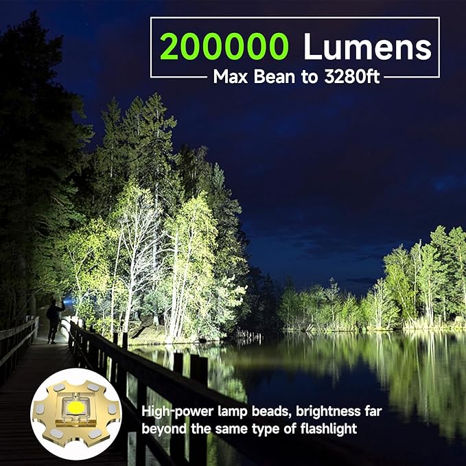 - 【200000 Lumens& 3280 Feet】The super bright flashlight uses a new upgraded led chip. The maximum output is 200,000 lumens and the maximum irradiation distance is 3280 feet. The rechargeable led flashlight adopts USB Type-C fast charging and IPX45 waterproof, which is mading of aviation aluminium alloy material.