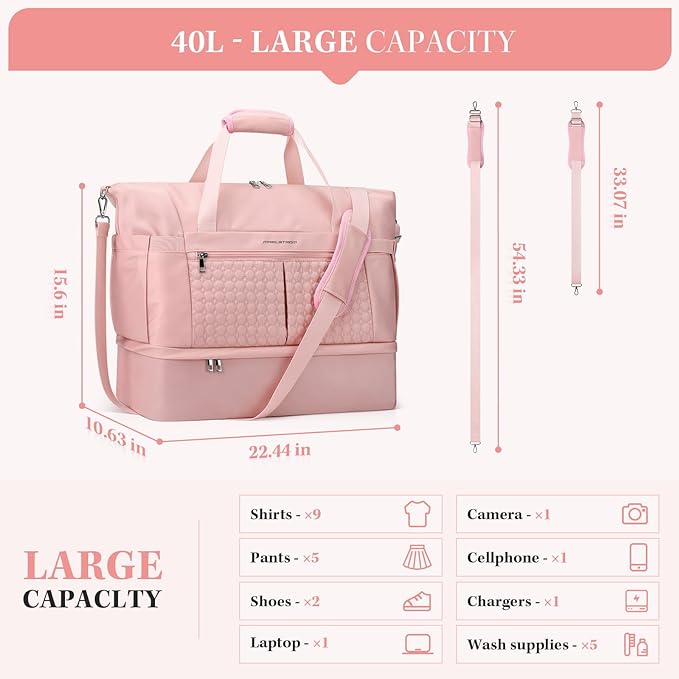 - Large Capacity:Measuring 22.44*10.63*15.6" inches, travel bag offers a generous 40L capacity that meets flight size standards. It features multiple pockets for organized storage of clothing, shoes, toiletries, laptop, iPad, and more, making it perfect for 5-7 days of travel.