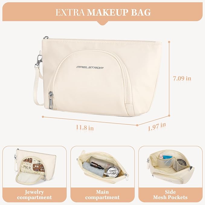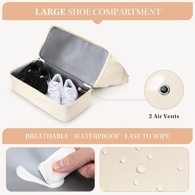 - Shoe Compartment and Cosmetic Bag: Keep shoes separate in the waterproof, easy-to-clean compartment with two ventilation ports. The roomy bottom section comfortably fits two pairs of shoes. The high-capacity cosmetic bag combines jewelry and cosmetic storage, ideal for travel and daily use.
