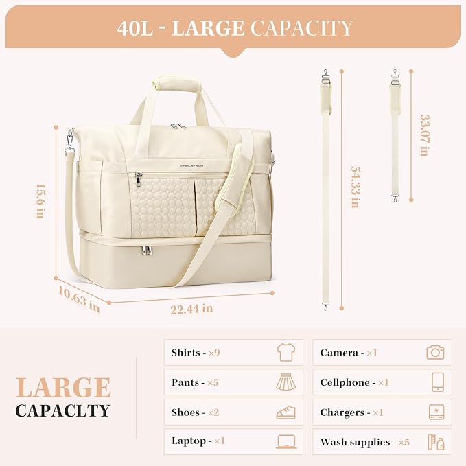 - Large Capacity:Measuring 22.44*10.63*15.6" inches, travel bag offers a generous 40L capacity that meets flight size standards. It features multiple pockets for organized storage of clothing, shoes, toiletries, laptop, iPad, and more, making it perfect for 5-7 days of travel.