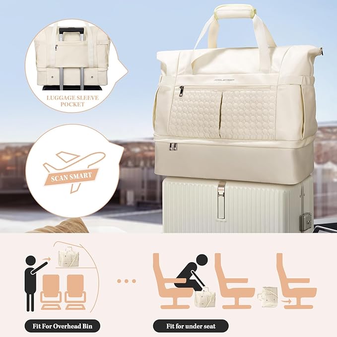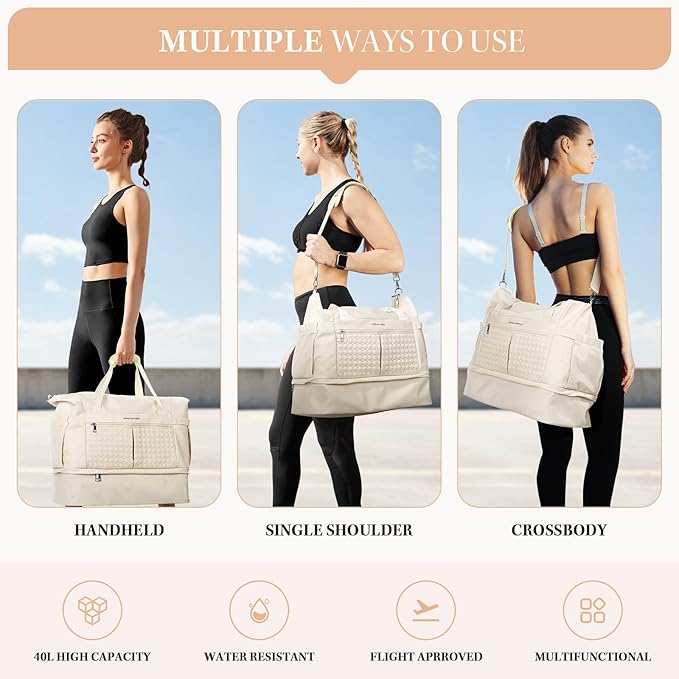 - versatile Use: Use it as an airplane travel bag, luggage tote bag, gym bag, weekend duffel, carry-on bag, or beach bag. Lightweight and versatile, it's perfect for travel, exercise, yoga, beach trips, and everyday activities.